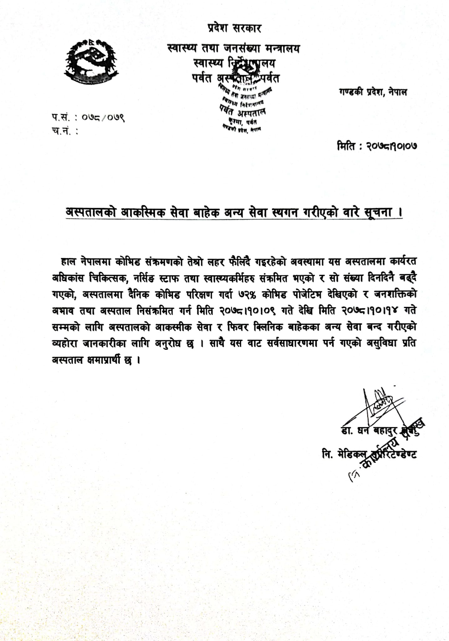 पर्वत अस्पतालका निमित्त सुपरिटेण्डेण्ट डिबी क्षेत्रीका अनुसार अस्पतालमा जनशक्ति अभाव सँगै निसंक्रमित गर्नका लागि माघ ९ गतेदेखि माघ १४ गतेसम्म अस्पतालका सेवा बन्द गरिएको हो । माघ ८ गते शनिबार आकस्मिक बाहेकका सेवा नहुनेभएपछि १० गते आइतबार देखि १४ गते सम्म सेवा बन्द गर्ने निणर्य गरिएको डाक्टर क्षेत्रीले बताउनुभयो ।