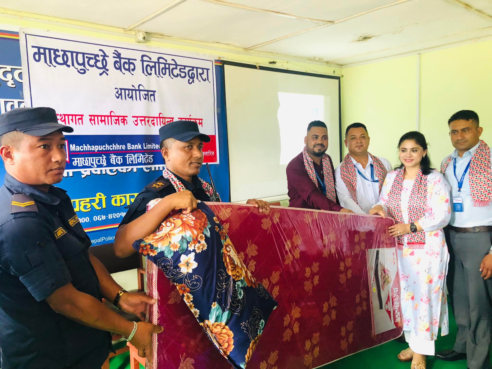 जिल्लामा सञ्चालित वित्तीय संस्था तथा अन्य कम्पनीले सामाजिक उत्तरदायित्तव अन्तरर्गत कार्यक्रम गरी बार्षिक रुपमा सामाजिक क्षेत्रमा सहयोग गर्नुपर्ने प्र्रावधान भएपनि सव्रै क्षेत्रबाट कार्यक्रम नभइरहेको अवस्थामा माछापुच्छ्रे बैकले उक्त कार्यक्रम आयोजना गरेको हो । बैंकले जिल्ला प्रहरी कार्यालय पर्वतमा आवश्यकता अनुरुप २५ थान मेट्रेस सहितको बेड विस्तारा सहयोग गरेको हो । माछापुच्छ्रे बैक लिमिटेड कुश्मा शाखाका प्रमुख सन्तोष कुमार केसीका अनुसार कार्यक्रम अन्तर्गत झण्डै ५० हजारको सहयोग उपलब्ध गराइएको थियो ।