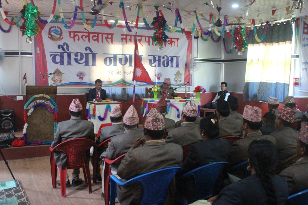 फलेवास नगरपालिकाको चौथो नगरसभामा सहभागी हुन आएका सभाषद्हरु सभाहलको बाहिरपट्टि उपस्थिति जनाउन लाइनबद्ध थिए । मंगलबार विहान साढे १२ बजेको समयमा ठिक शुरु गर्ने भनिएको कार्यक्रम तोकिएको समयभन्दा केही घर्किएको थियो, सभाषद् लाइनमा बसेर उपस्थिति जनाउँदा जनाउँदै जनाउ घन्टी बज्यो, सबै सभासद र आमन्त्रित पाहुना आ–आफ्ना परिचयपत्र भिरेर भित्र पस्न के लागेका थिए फलेवास प्रहरी चौकीबाट खटिएका सुरक्षाकर्मीहरुबाट सहभागीहरुलाई झोला र महत्वपूर्ण सामान बाहिरै राख्न अनुरोध गरियो । त्यसपछि सभाषद् भित्र प्रबेश गरेको केही मिनेटमा नै नगरप्रमुख पदमपाणी शर्मा सभाकक्षमा प्रबेश गरे संगै राष्ट्रियगानको धुन बज्यो । धुन सकिएपछि नगरप्रमुखले सरासर रोष्टममा गएर नगरसभा शुरुवात भएको जानकारी सँगै कार्यक्रम तालिका अनुसार विधेयक प्रस्तुत गर्नुभयो ।