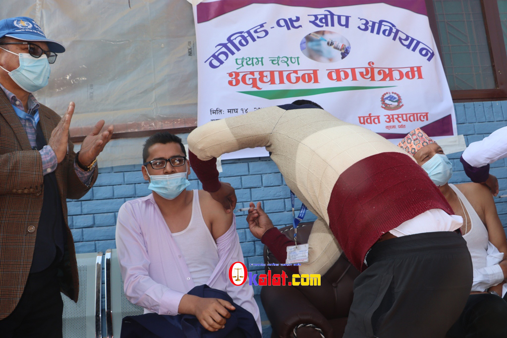 पहिलोचरणका कार्यक्रम अन्तर्गत कुश्मा नगरपालिका कार्यक्षेत्र भएका ३५, पर्वत अस्पतालमा कार्यरत ८२, स्वास्थ्य कार्यालयमा कार्यरत १२ र शव व्यवस्थापनमा खटिएका चार जना सुरक्षाकर्मी गरी एक सय ३३ जनालाई बुधबार खोप लगाउने कार्य भइरहेको र दिउँसो ३ बजेको समय सम्म ६० जना भन्दा बढीले खोप लगाइसकेका छन् ।